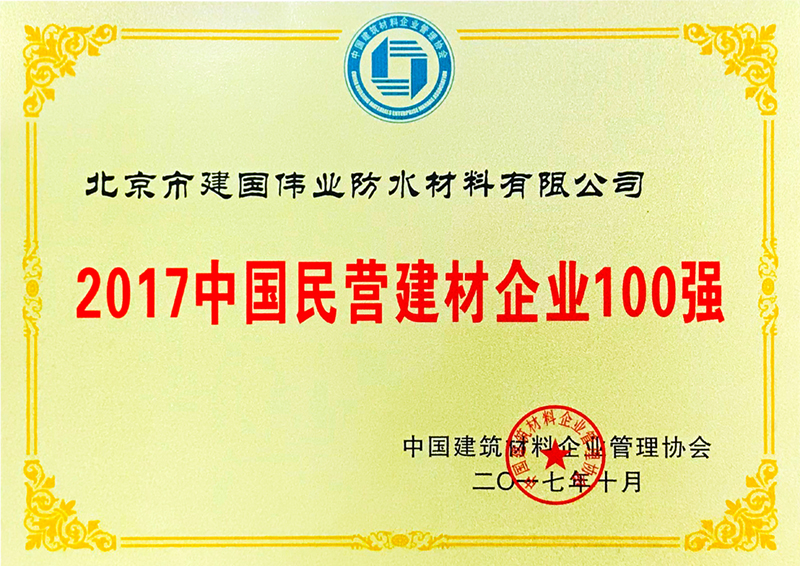 中國(guó)建筑材料企業(yè)管理協(xié)會(huì)于2017年10月26日在北京召開了2017年度中國(guó)建材企業(yè)500強(qiáng)、建筑服務(wù)業(yè)100強(qiáng)、民營(yíng)建材企業(yè)100強(qiáng)和最具成長(zhǎng)性建材企業(yè)100和園區(qū)20強(qiáng)暨防水技術(shù)交流會(huì),來(lái)自全國(guó)各地的近千余名會(huì)員代表出席了會(huì)議。會(huì)議上,建國(guó)偉業(yè)榮獲“2017中國(guó)民營(yíng)建材企業(yè)100強(qiáng)”稱號(hào)。